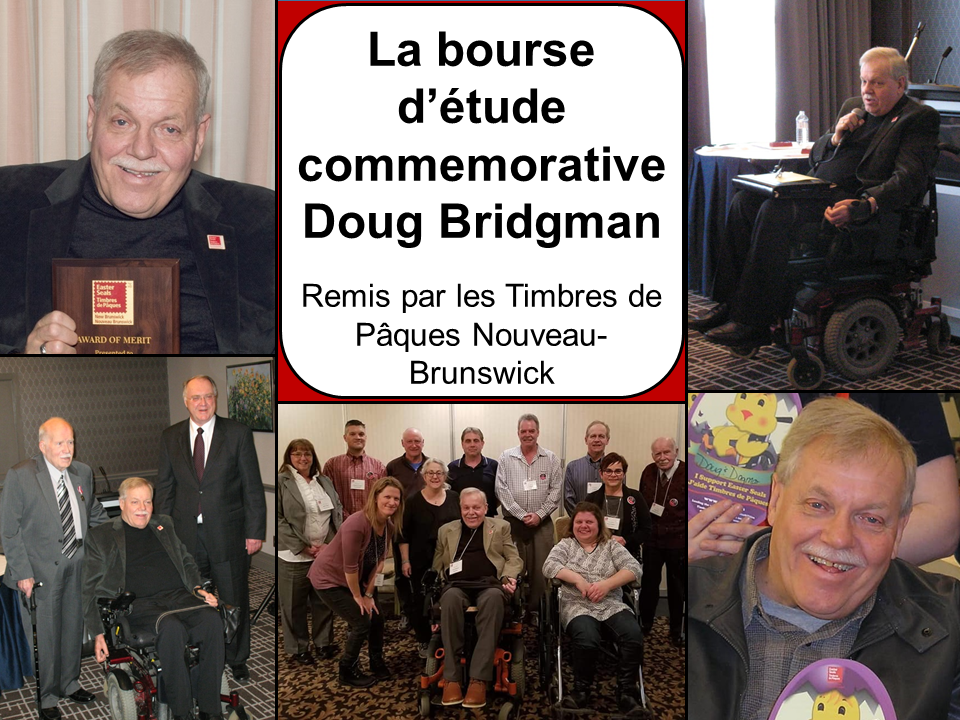 La Bourse d’études commémorative Doug Bridgman est décernée en reconnaissance d’un défenseur et porte-parole de la devise « Rien sur nous sans nous » en laquelle il croyait profondément. Doug a fait sa contribution au cours de nombreuses années aussi bien par son bénévolat que par son travail, quand il a pris en charge un poste de dirigeant au Département de l’Égalité d’accès aux emplois du Nouveau-Brunswick. Il s’est engagé comme volontaire dans des organisations pour handicapés, y compris les Associations pour paraplégiques du Nouveau-Brunswick et du Canada ainsi que les Timbres de Pâques du NB et du Canada. Il a aussi organisé le basket-ball et le rugby en fauteuil roulant et il y a participé lui-même. En tant qu’entrepreneur, il a lancé le premier taxi accessible à Fredericton, qu’il a nommé, de façon enjouée, le «Bat Mobile». Son dévouement et son engagement pour les chances égales et la dignité des personnes handicapées se sont manifestés dans tous les aspects de sa vie. Cette bourse d’études a été développée afin de venir en aide aux personnes ayant un handicap physique et qui désirent obtenir une éducation postsecondaire. Un étudiant chaque année recevra une bourse de 1 000.00$. La bourse sera accordée au candidat en fonction de son admissibilité et des documents qu’il aura soumis en son nom.